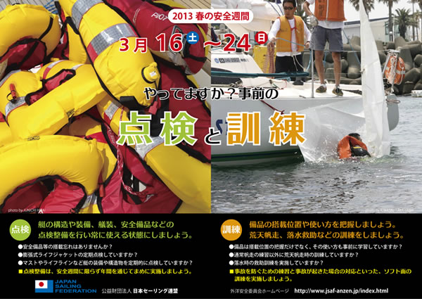 「2013 春の安全週間」 期 間 :2013 年 3 月 16 日(土)〜24 日(日) 主テーマ:事前の「点検と訓練」 艇の構造や装備、艤装、安全備品などの点検整備を行い常に使える状態にしておく。 装備や備品の搭載位置を確認し、備品の使い方や荒天帆走、落水救助といった事前 の訓練を実施すること。